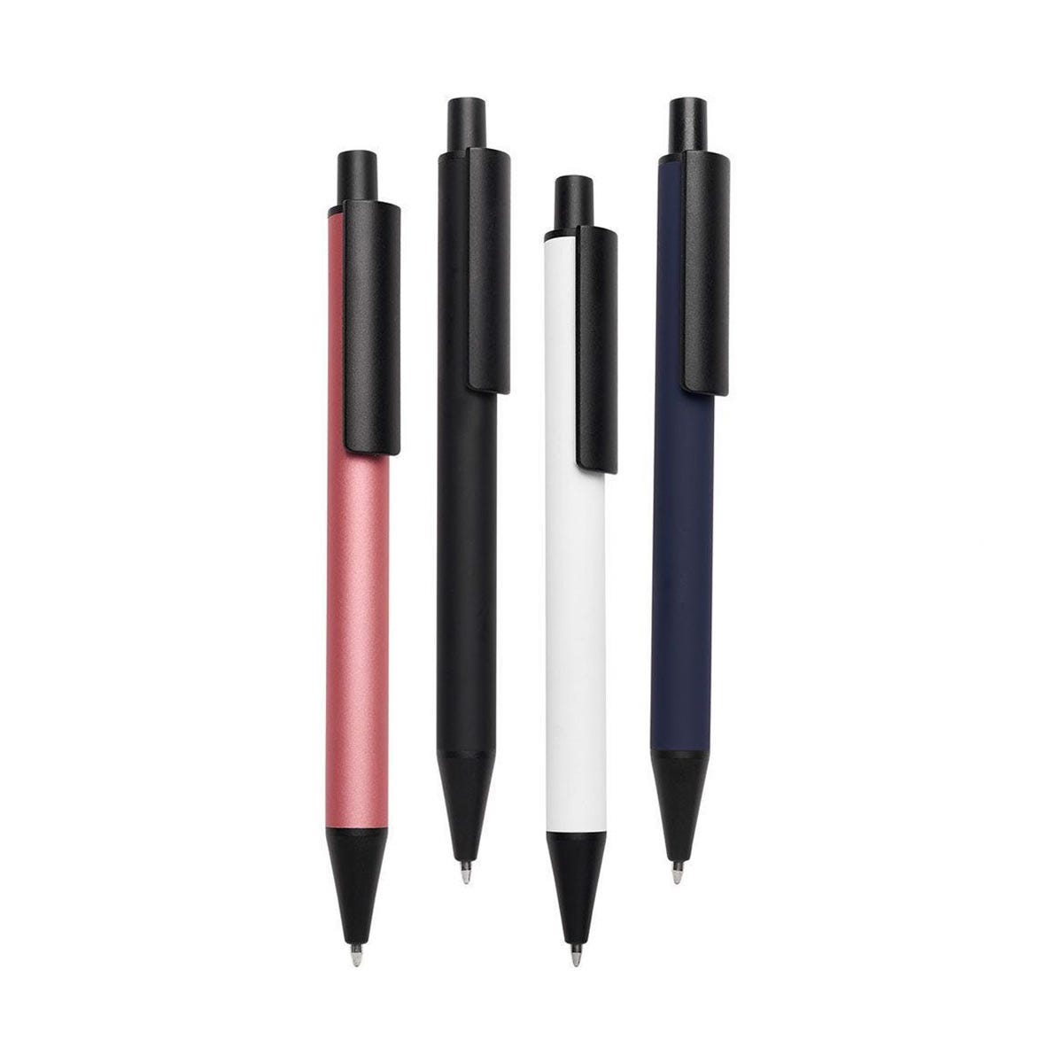Set de 3 bolígrafos de tinta negra, azul y roja. Incluye estuche de plástico con sistema push. La base del bolígrafo indica la tinta con el color correspondiente.